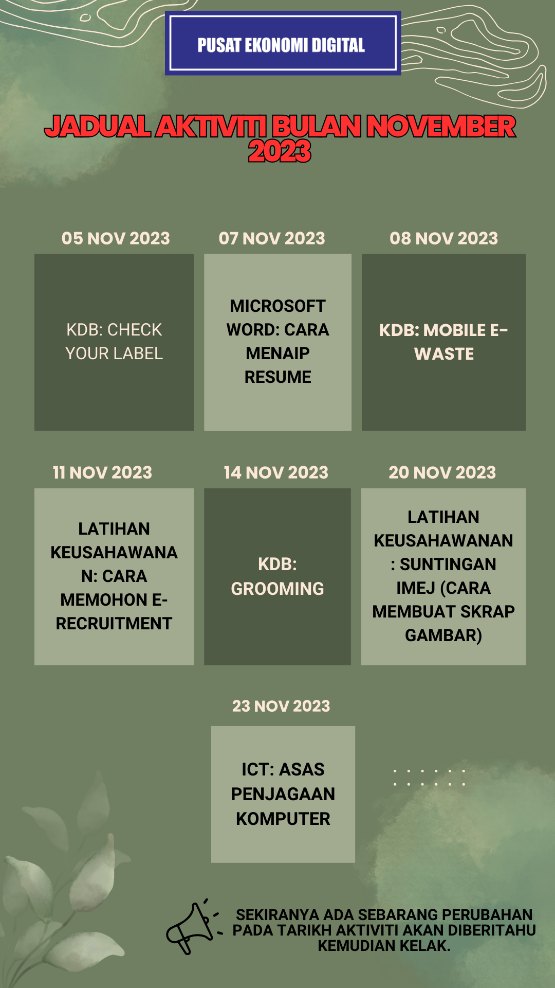 Tarikh : 05 Januari 2024 Masa : 2:00 petang – 4:00 petang Lokasi : PEDi Sg Pelajau Peserta : 5 orang Tujuan: Peserta diberi penerangan tentang tajuk iaitu berkaitandenganpenipuan kewangan. Penipuan kewangan boleh didefinisikan sebagai aktiviti yang mengandungi unsur tipu helah yang […]